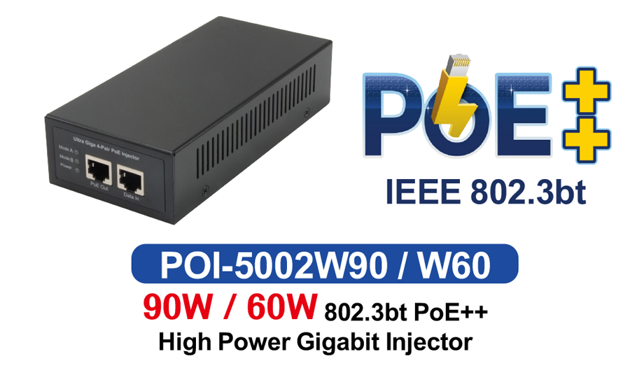 德國網絡名牌 LevelOne推出全新802.3bt PoE++ High Power Gigabit Injector - POI-5002W90/ POI-5002W60。POI-5002W90/ POI-5002W60最高輸出電量分別為90W/ 60W,符合標準IEEE 802.3af/at/bt PoE制式,最大傳輸距離達100米,不但能滿足10/100Base-T 或1000Base-T器材(e.g. VoIP、IP Camera、Wi-Fi 6 AP等)的電力應用,更能維持1000Mbps傳輸速度的高頻寬網絡;對於需要高電量支援的器材亦為適合(如: Pan/Tilt/Zoom內置電子防潮功能的IP Camera),絕對可解決供電不足的情況。