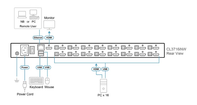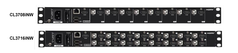 CL3708iNW/3716iNW提供8-port/16-port HDMI端口連接,可通過IP遠端管理8/16台伺服器。