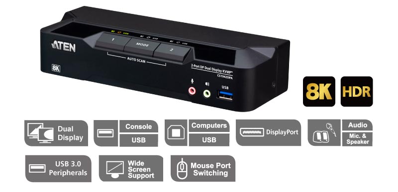 ATEN 最新2 Port USB 3.0 8K DisplayPort 雙螢幕 KVMP多電腦切換器 - CS1942DPA