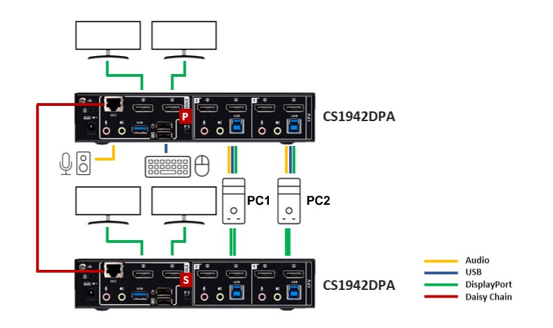 CS1942DPA支援Daisy Chain Control (DCC) ,設有獨立RJ45菊鍊串接專用埠,透過菊鏈串接 2 CS1942DPA組成4畫面整合顯示,以一套鍵盤及滑鼠簡易控制。